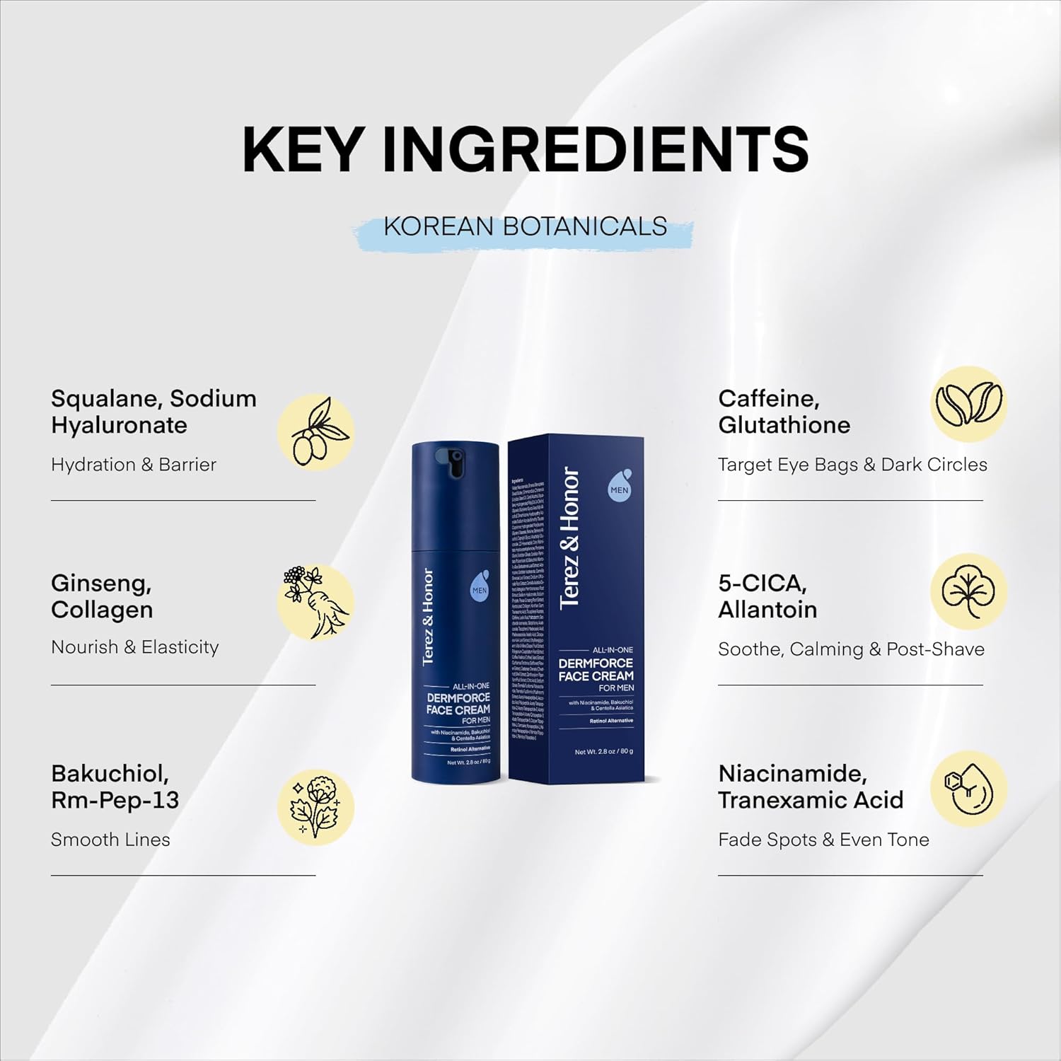 • Skin Concerns: Fine lines, loss of elasticity, dullness, dryness, dark circles, puffiness, uneven tone, and post-shave irritation